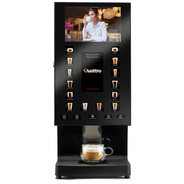 Taking a huge step forward, the all new, state of the art Quattro. With crisp, clear HD screen technology, unrivalled versatility and features for a machine of this size. The soluble dispenser with a touch of class.